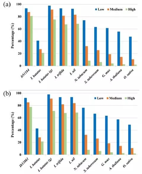 為了評(píng)估甘薯、野生甘薯的轉(zhuǎn)錄本和其他植物基因的相似性,我們比較了甘薯、野生甘薯與其他植物的開(kāi)源CDS數(shù)據(jù)庫(kù),包括紅苔藤、野生甘薯、牽?;ā煵?、馬鈴薯、大豆、擬南芥和水稻。結(jié)果表明甘薯和野生甘薯大多數(shù)的轉(zhuǎn)錄本都是同源的,說(shuō)明這兩個(gè)物種擁有一個(gè)大致相同的基因庫(kù)。觀察高比例的轉(zhuǎn)錄本發(fā)現(xiàn),盡管這些物種中的大量基因在進(jìn)化過(guò)程中存在著巨大的差異,但仍然共有一些短的motif,說(shuō)明這些基因在進(jìn)化上顯示出高度的保守性。