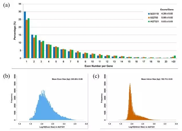 三代測(cè)序得到的全長(zhǎng)cDNA對(duì)于研究基因的結(jié)構(gòu)非常有用,例如分析外顯子-內(nèi)含子的結(jié)構(gòu)。我們隨機(jī)挑選了50個(gè)基因進(jìn)行比較,發(fā)現(xiàn)這些基因含有的外顯子數(shù)目在甘薯、野生甘薯和擬南芥三個(gè)植物中的分布是相似的。
