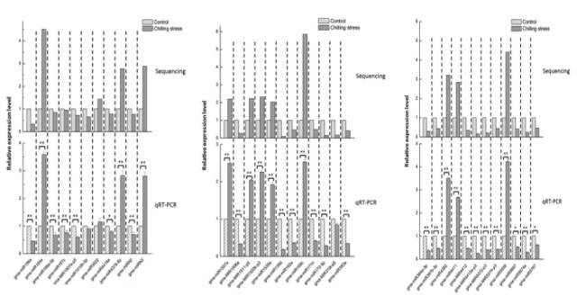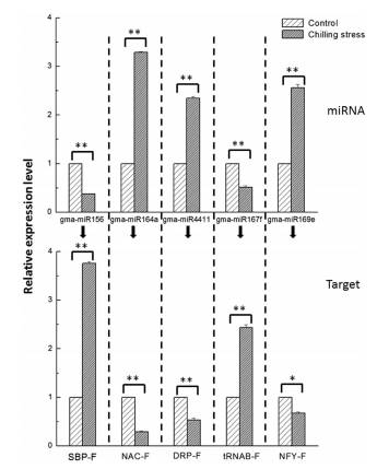 對相應(yīng)靶基因進(jìn)行功能注釋來研究差異表達(dá)的miRNA可能行使的功能。差異表達(dá)的miRNA可以分為四類。第一類包括miRNA家族(miR156、miR164、miR169、miR4412和miR5327),靶基因?yàn)檗D(zhuǎn)錄因子SBP、NAC、NFY、GRAS和bHLH,參與調(diào)控基因表達(dá)和信號傳導(dǎo)。第二類包括miR4411,其對應(yīng)靶基因涉及抵御疾病。第三類包括miR5761、miR159、miR5667、miR1535、miR511、miR4382和miR4416,其對應(yīng)靶基因參與植物生長發(fā)育中的適應(yīng)性。為了進(jìn)一步確認(rèn)冷脅迫下miRNA和靶基因的關(guān)系,選擇了5個(gè)miRNAs及其靶基因進(jìn)行qRT-PCR驗(yàn)證。結(jié)果表明,在冷脅迫下miRNA-164a,miRNA-4411和miRNA-169e上調(diào)。相反的,他們的靶基因NAC、DRP和NFY顯著下調(diào)。說明miRNA和對應(yīng)靶基因呈負(fù)相關(guān)性。
