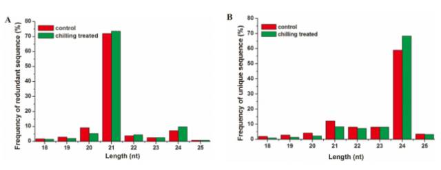 對照組和處理組分別獲得6559098和8273245 clean reads。長度為21nt所占比例*高(圖1A)。非冗余的reads,長度分布統(tǒng)計(jì)可以看出24nt所占比例*高,在對照組和處理組中分別為68.4%和59%(圖1B)。
