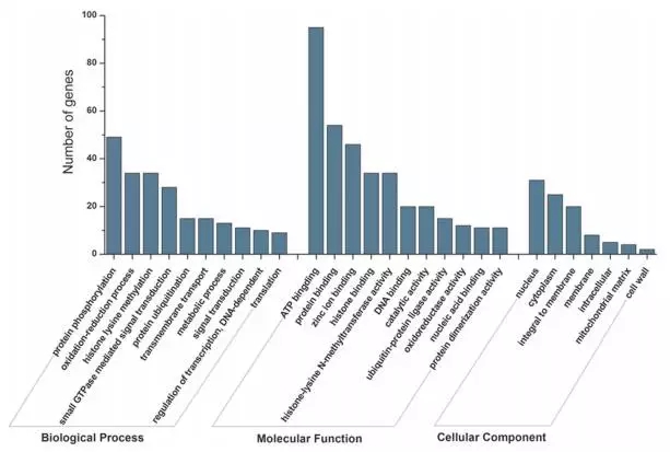 為了近一步確認(rèn)這些差異表達(dá)miRNA的功能,對靶基因進(jìn)行GO分析。靶基因共參與了56個(gè)分子功能terms,37個(gè)生物學(xué)過程terms和7個(gè)細(xì)胞組分terms。在分子功能分類下,ATP結(jié)合、蛋白結(jié)合、組蛋白結(jié)合等terms是顯著富集的。超過35%miRNAs的靶基因參與了生物學(xué)過程途徑。