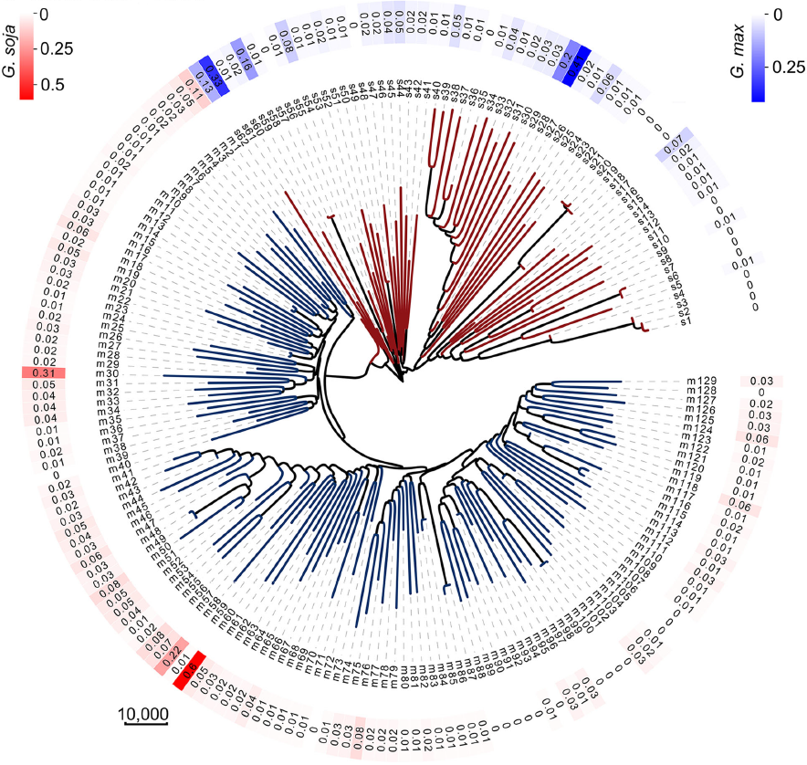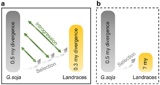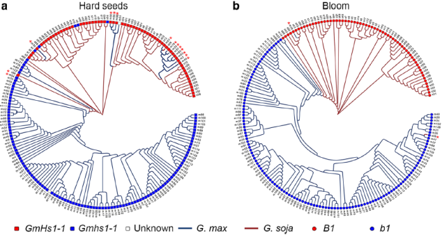 基因滲入被認(rèn)為是基因流的主要途徑,那么基因流如何在種群水平上影響馴化過程和大豆基因組的遺傳結(jié)構(gòu)?現(xiàn)有研究已分離出分別控制種子硬度和種皮開花的關(guān)鍵大豆馴化基因GmHs1-1和Bloom1(B1),圍繞GmHS1-1、Gmhs1-1和B1、b1基因座的兩個(gè)選擇性掃除區(qū)域中的SNP分析系統(tǒng)發(fā)育關(guān)系發(fā)現(xiàn)基因滲入現(xiàn)象在這兩個(gè)區(qū)域均有存在??紤]到野生大豆和栽培大豆亞種的系統(tǒng)發(fā)育差異,在研究種群中兩個(gè)馴化基因位點(diǎn)檢測到的選擇性掃描區(qū)域和單倍型的混合將被視為亞種群間基因流動(dòng)的進(jìn)一步證據(jù)。