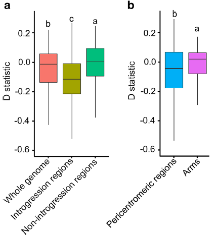 具有推定基因滲入?yún)^(qū)域的D統(tǒng)計(jì)量顯著低于沒有推定基因滲入?yún)^(qū)域,并且也顯著低于全基因組平均水平,這表明野生大豆和栽培大豆間的基因流與這些基因區(qū)域有關(guān)(圖3)。