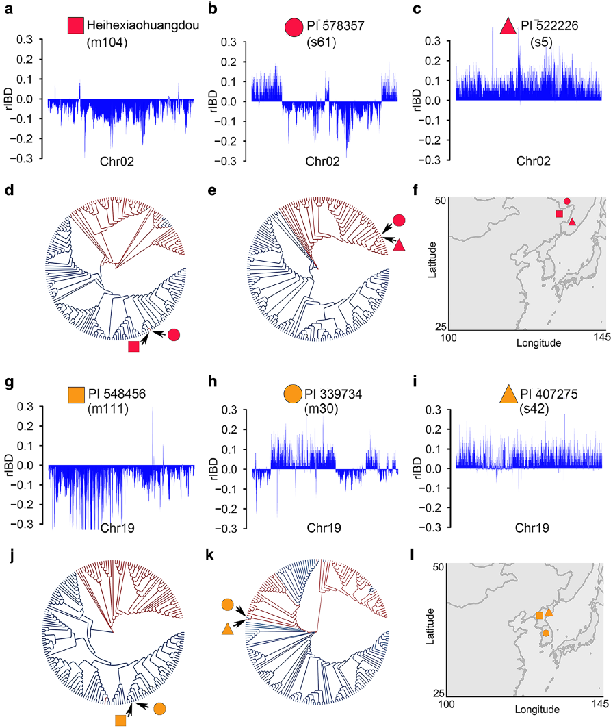 (a-c)黑河小黃豆, PI 578357和PI 52226三個(gè)材料中基因組成分在2號染色體的分布(d)基于2號染色體基因滲入?yún)^(qū)域SNP構(gòu)建的進(jìn)化樹揭示的PI 578357中PI 52226成分的起源(e)基于2號染色體非基因滲入?yún)^(qū)域SNP構(gòu)建的進(jìn)化樹揭示的PI 578357中黑河小黃豆成分的起源(f)上述三個(gè)材料的地理分布(g-i) PI 548456, PI 339734和PI 407275三個(gè)材料中基因組成分在19號染色體的分布(j)基于19號染色體基因滲入?yún)^(qū)域SNP構(gòu)建的進(jìn)化樹揭示的PI 339734中PI 548546成分的起源(k)基于19號染色體非基因滲入?yún)^(qū)域SNP構(gòu)建的進(jìn)化樹揭示的PI 339734中PI 407275成分的起源(l)上述三個(gè)材料的地理分布