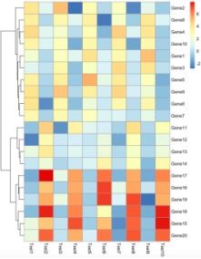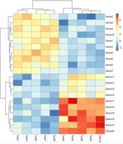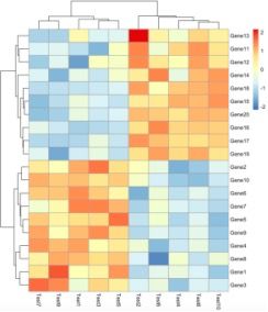 為了模擬不同樣品和基因之間的差異,我們將第一行到第10行中奇數(shù)列的數(shù)值全部加3,將第11行到第20行的偶數(shù)列數(shù)值全部加2,將15行到20行的偶數(shù)列全部加4。最后將列名命名為Test1 ~ Test10,將行名命名為Gene1~Gene 20,最終生成的數(shù)據(jù)格式如下圖