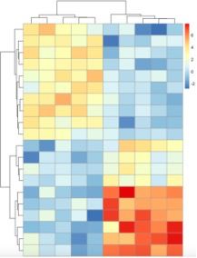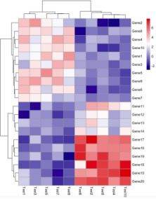 # scale = “row”的含義是繪圖時按行進行均一化。進行均一化可以降低個別特殊樣品與其它樣品間的差異,這會使得其它樣品間的差異在圖形中更加顯著。一般我們在基于表達量進行聚類分析時,均是常用的參數(shù)。繪圖結(jié)果如下圖所示: