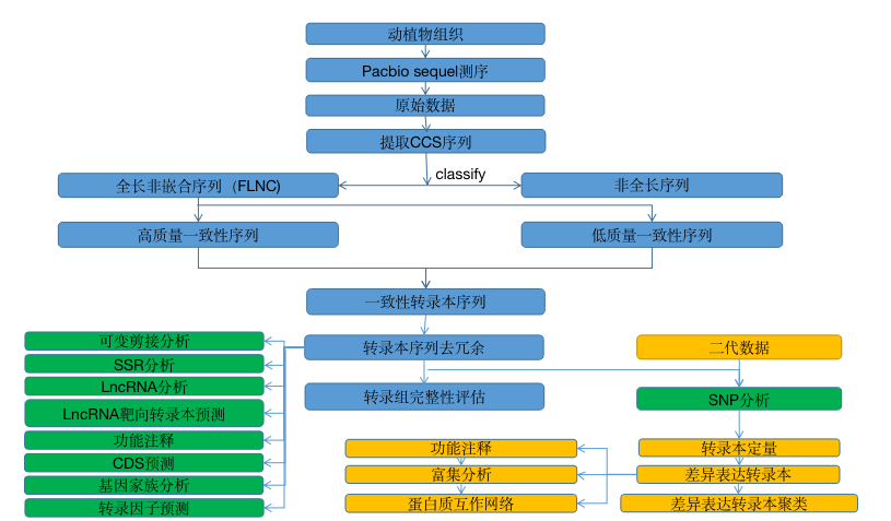 全長轉(zhuǎn)錄組研究是理解生物機(jī)體功能的一個重要途徑。傳統(tǒng)二代轉(zhuǎn)錄組測序無法直接獲得單個RNA分子由5ˊ到3ˊ的全部序列。基于PacBio三代測序平臺的轉(zhuǎn)錄組研究,無需打斷,直接讀取反轉(zhuǎn)錄的全長cDNA,能夠有效的獲取高質(zhì)量的單個RNA分子的全部序列,準(zhǔn)確辨別二代測序無法識別的同源異構(gòu)體(isoform)、同源基因、超家族基因或等位基因表達(dá)的轉(zhuǎn)錄本。
