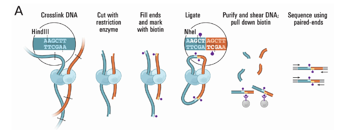 Hi-C技術(shù)是染色質(zhì)構(gòu)象捕獲技術(shù)( Chromosome conformation capture )與高通量測序( High-throughput sequencing )結(jié)合衍生的一種技術(shù)。主要是利用全基因組范圍內(nèi)整個(gè)染色質(zhì)DNA在空間位置上的關(guān)系,對染色質(zhì)內(nèi)全部DNA相互作用模式進(jìn)行捕獲,結(jié)合生物信息學(xué)方法,來獲得染色體水平的基因組序列并得到染色質(zhì)三維結(jié)構(gòu)信息。此外還可以并與Chip-seq、轉(zhuǎn)錄組數(shù)據(jù)聯(lián)合分析,從基因調(diào)控網(wǎng)絡(luò)和表觀遺傳網(wǎng)絡(luò)來闡述生物體性狀形成的相關(guān)機(jī)制。