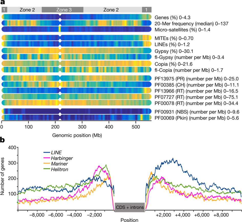 利用染色體位置信息,通過對20-mer頻率將染色體進(jìn)行劃分成了三種區(qū)域,每種區(qū)域上在基因密度,重組率,LTR插入時(shí)間以及GC含量上都存在一定的規(guī)律。