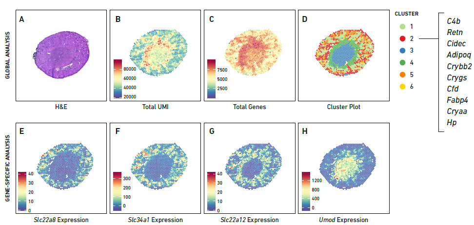 A代表組織切片的HE染色。B和C分別代表UMI計數(shù)和總基因計數(shù)與組織空間位置的圖像疊加。D代表基于總體差異表達基因的空間聚類結(jié)果,最右邊顯示了cluster2排名前10的特異表達基因。E、F、G、H分別代表了不同基因的空間mRNA表達。