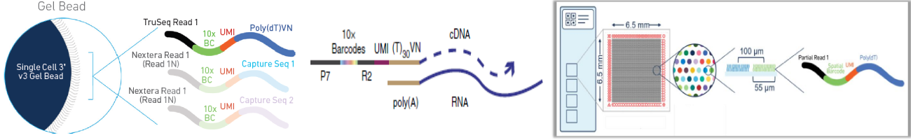 10x Genomics空間轉(zhuǎn)錄組用于文庫構(gòu)建的每張載玻片上有四個捕獲區(qū)域,每個捕獲區(qū)域的大小為6.5×6.5mm,包含5000個被條形碼標記的點(barcoded spots),每個點的直徑為55 μm,點和點之間中心的距離為100 μm,并且每個點都有一個唯一的barcode序列。