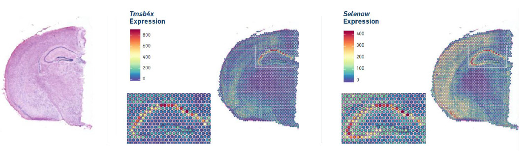 A代表組織切片的HE染色。B和C分別代表海馬組織的標記基因Tmsb4x和Selenow基因的空間表達情況,結(jié)果顯示這兩個基因在海馬體中顯著高表達,符合已知的基因表達模式