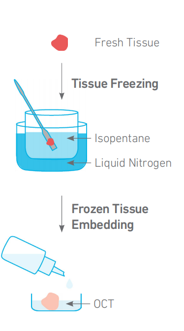 實驗流程為:新鮮組織取樣-異戊烷凍存-OCT包埋-冷凍切片-染色-顯微鏡觀察-建庫測序 需要客戶準備:新鮮組織取樣–異戊烷凍存(保存或運輸)–OCT包埋–保存或運輸 客戶在制備樣本時,需要準備3份樣本(至少2份),每塊組織樣本不宜過大(長寬高約0.8 cm )