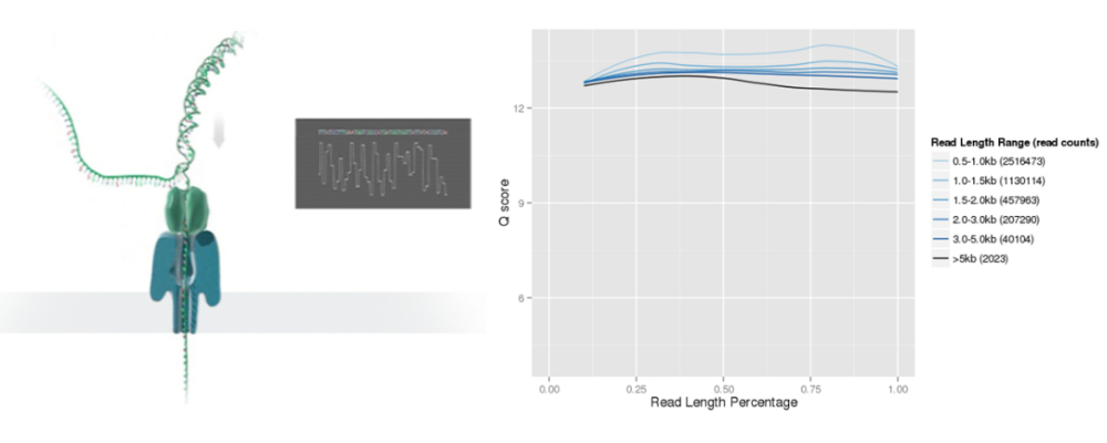 nanopore測序是基于電信號識別堿基序列的三代測序技術(shù)。DNA/RNA上不同堿基或帶不同修飾時化學(xué)性質(zhì)存在差異,當(dāng)單鏈分子通過納米孔通道時,堿基造成的阻礙大小不一,因此會形成特征性離子電流變化信號。通過對這些信號進(jìn)行實時檢測,即可獲得相應(yīng)堿基類型,完成測序。目前通過“遞歸神經(jīng)網(wǎng)絡(luò)(Recurrent Neural Network)”的復(fù)雜算法對堿基進(jìn)行判讀。