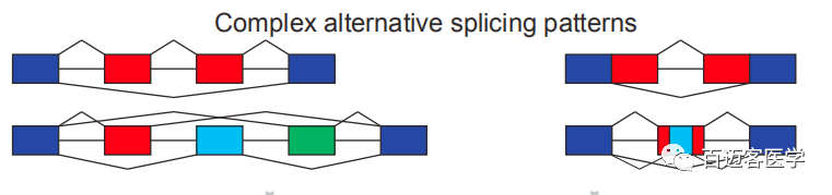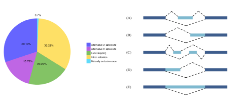 基因轉(zhuǎn)錄生成的前體mRNA(pre-mRNA),有多種剪接方式,選擇不同的外顯子,產(chǎn)生不同的成熟mRNA,從而翻譯為不同的蛋白質(zhì),構(gòu)成生物性狀的多樣性。這種轉(zhuǎn)錄后的mRNA加工過程稱為可變剪接或選擇性剪接(Alternative splicing)??勺兗艚宇愋桶ǎ?A) 外顯子跳躍;(B) 可變轉(zhuǎn)錄終止位點;(C) 可變外顯子;(D)可變轉(zhuǎn)錄起始位點;(E) 內(nèi)含子保留。