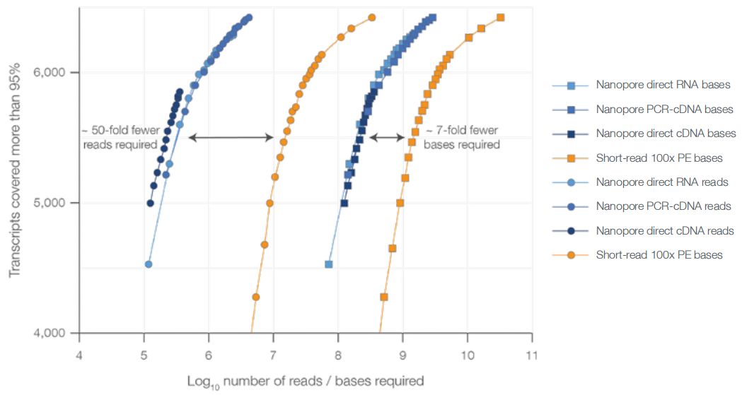 ONT全長轉(zhuǎn)錄組測序一條reads即代表該轉(zhuǎn)錄本表達(dá)一次,而二代短reads需要非常多條才能覆蓋一個轉(zhuǎn)錄本;oxford nanopore公司官方白皮書中數(shù)據(jù)顯示:當(dāng)相同數(shù)量的轉(zhuǎn)錄本被覆蓋達(dá)95%時,ONT所需要的reads數(shù)比Illumina約少50倍,所需要堿基數(shù)約少7倍。