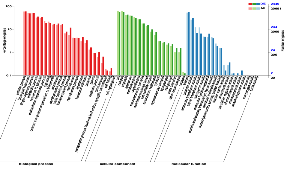 GO注釋分類統(tǒng)計圖,直觀的反映出在生物過程(biological process)、細(xì)胞組分(cellular component)和分子功能(molecular function),可深入挖掘差異基因和轉(zhuǎn)錄本的功能及所在的信號通路,篩選關(guān)注差異基因和轉(zhuǎn)錄本注釋情況。