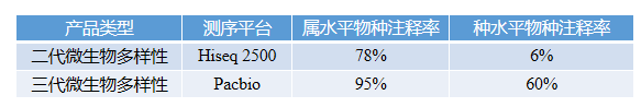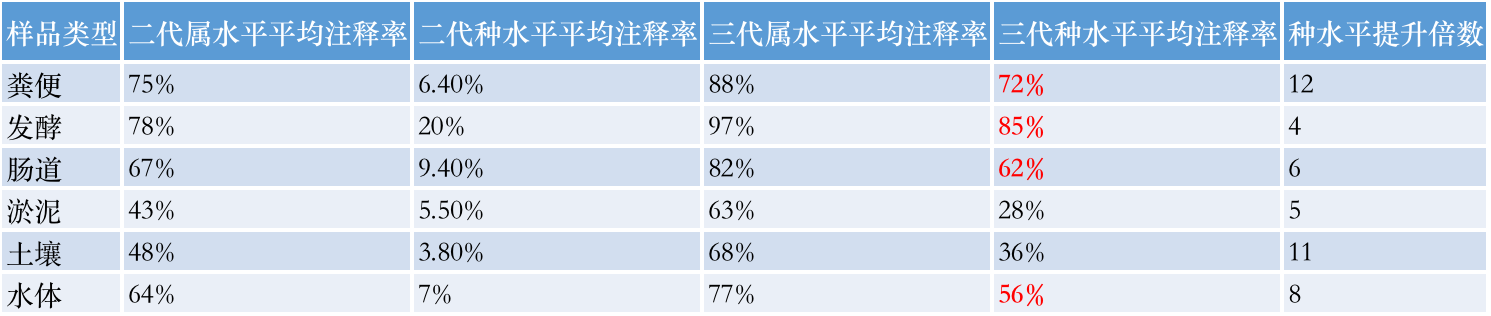我們對不同類型的樣品如:土壤、糞便、腸道、水體等,隨機(jī)挑選了30個項目對其進(jìn)行物種注釋率進(jìn)行研發(fā)優(yōu)化,目前采用優(yōu)化數(shù)據(jù)庫及注釋方法的策略,將其種水平平均注釋率提升到60%+。二代注釋到屬和種的平均比例為78%和6%,相同樣品采用三代進(jìn)行注釋時,屬和種水平平均注釋率為95%和60%,注釋結(jié)果提升非常明顯。