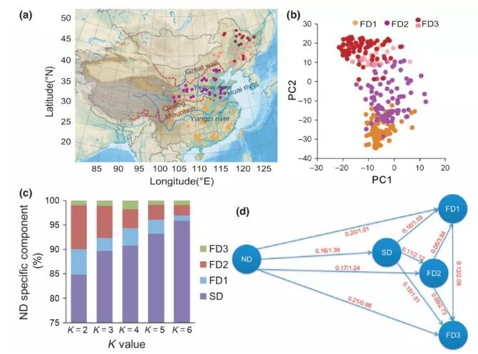 (2)通過基因滲透和PCA分析推出半馴化品種是一種進(jìn)化上的中間產(chǎn)物,而不是馴化品種和野生大豆雜交產(chǎn)生的,此外,三群體檢測(cè)的結(jié)果也進(jìn)一步論證了這一點(diǎn),同時(shí),論證出栽培大豆是從中部黃淮海地區(qū)向北向南馴化,進(jìn)而將中國(guó)馴化大豆起源√確的定位到中國(guó)中部黃淮海區(qū)域。