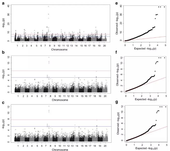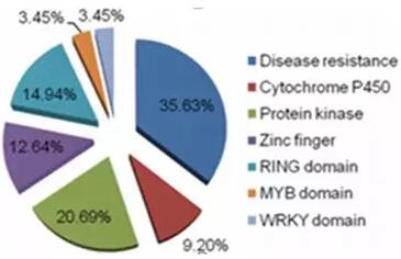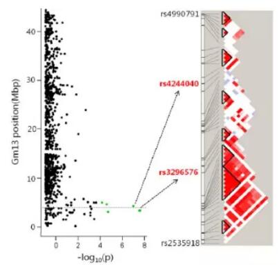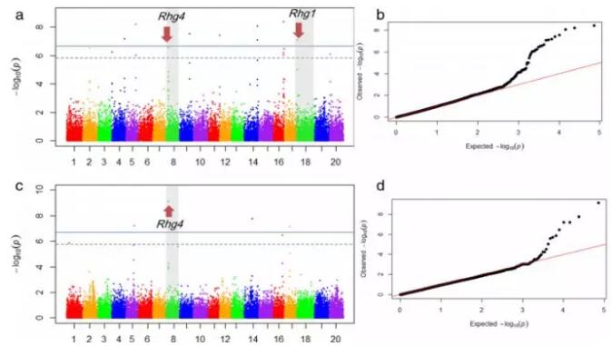 (2)通過全基因組關(guān)聯(lián)分析找到19個(gè)與胞囊線蟲抗性相關(guān)的位點(diǎn),其中8個(gè)位點(diǎn)與之前報(bào)道過的QTL位點(diǎn)重合,8個(gè)位點(diǎn)與已經(jīng)報(bào)道的抗胞囊線蟲基因Rhg4及Rhg1連鎖,并鑒定出3個(gè)新的QTL位點(diǎn)。通過基因注釋獲得到與抗病,細(xì)胞色素P450,蛋白激酶等相關(guān)的功能基因。