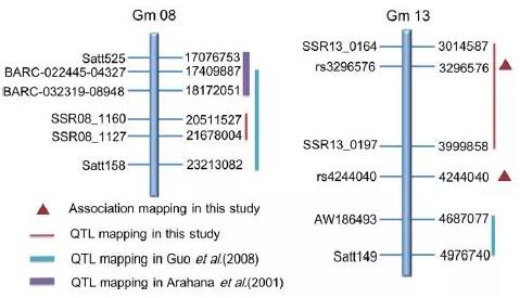 (2)在前人研究基礎(chǔ)上,利用Gm01, Gm08, Gm11和Gm13上的78個(gè)SSR構(gòu)建遺傳圖譜,在Gm13上定位到主效QTL位點(diǎn)Oswm13-1。