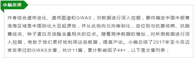 大豆作為重要的農(nóng)作物,在我國(guó)有著6000-9000年的馴化史,其馴化方向主要與產(chǎn)量、品質(zhì)和抗病等性狀相關(guān)。東北農(nóng)業(yè)大學(xué)的李文濱教授及其團(tuán)隊(duì)和北京百邁客生物科技有限公司合作,在大豆起源、抗菌核病、抗胞囊線蟲、種子蛋白及油脂含量方面取得重要進(jìn)展,其研究成果相繼發(fā)表在New Phytologist、The Plant Journal、BMC Genomics和Genomics,累計(jì)影響因子23+。下面我們就看看作者是如何對(duì)數(shù)據(jù)進(jìn)行深入挖掘,做到低投入、高產(chǎn)出的。
