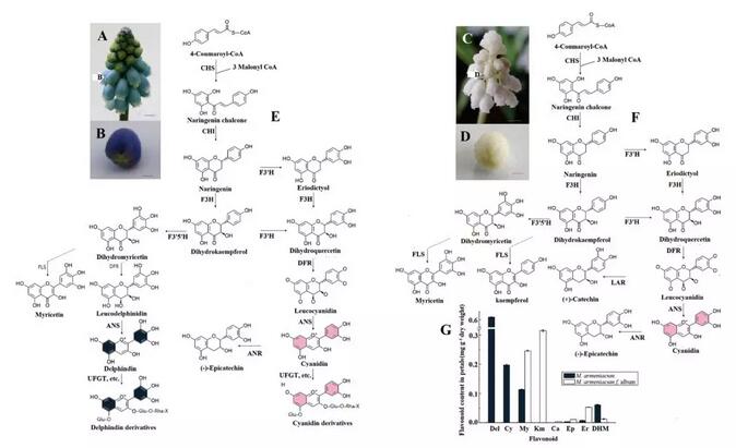 葡萄風(fēng)信子(Muscari)是一種重要的觀賞性球根植物,具有獨(dú)特藍(lán)色、花形和甜香。天然突變種白色風(fēng)信子為探究某些潛在生化特征,特別是顏色相關(guān)的復(fù)雜代謝網(wǎng)絡(luò)研究提供了機(jī)會。據(jù)報道,花青素是風(fēng)信子花色的主要色素。藍(lán)色花主要由飛燕草色素(Del)決定,紅色花由花青色素(Cy)決定。花青素是植物科學(xué)中研究最多和最了解的化合物之一,然而,在不同植物中調(diào)控花青素分解代謝的分子機(jī)制還遠(yuǎn)遠(yuǎn)沒有定論。