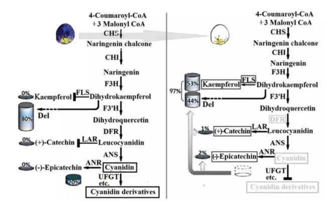 白色風(fēng)信子花瓣中兒茶素(catechin )和表兒茶素(epicatechin )的存在,表明紅色Cy一定存在于白色花中,即使只是很短的時間或很少的量,暗示著Cy色素丟失的復(fù)雜代謝機(jī)制。Cy合成上游反應(yīng)中的通路的受阻以及下游反應(yīng)中的多重分支變化過程,最終導(dǎo)致白花紅色色素的消失。