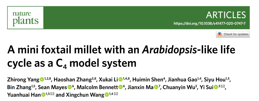 2020年8月31日,山西農(nóng)業(yè)大學(xué)雜糧分子育種團隊與中國農(nóng)業(yè)科學(xué)院作物科學(xué)研究所等單位合作研究論文“A mini-foxtail millet with an Arabidopsis-like life cycle as a C4 model system”在線發(fā)表于國際期刊Nature Plants(IF:13.256),報道了C4禾谷類研究的理想模式植物“小米”的研究成果。山西農(nóng)業(yè)大學(xué)的楊致榮教授、中國農(nóng)業(yè)科學(xué)院作物科學(xué)研究所的張皓珊博士和山西農(nóng)業(yè)大學(xué)的李旭凱副教授為論文的共同第一作者;山西農(nóng)業(yè)大學(xué)的王興春教授、韓淵懷教授和中國農(nóng)業(yè)科學(xué)院作物科學(xué)研究所的隋毅副研究員為論文的共同通訊作者。美國普渡大學(xué)和英國諾丁漢大學(xué)等單位參與了部分研究。百邁客有幸參與了其中基因組、轉(zhuǎn)錄組及數(shù)據(jù)庫構(gòu)建工作。目前,數(shù)據(jù)庫由百邁客負(fù)責(zé)維護和運行,暫時托管在公司服務(wù)器(http://foxtail-millet.biocloud.net/home)。