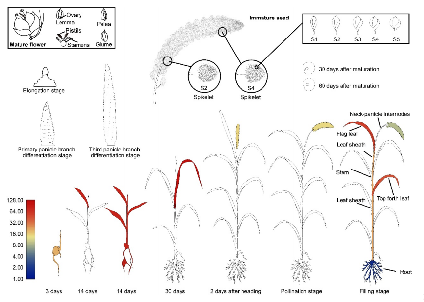 11個不同的組織:3日齡種子(種子)、2周齡整株苗(苗)、根、莖、2周齡苗的第一片全展葉(葉1),30日齡植株頂?shù)诙~(葉2)、旗葉(葉3)、第四葉(葉4)、未成熟的圓錐花序(圓錐花序1)、授粉期圓錐花序(圓錐花序2)、灌漿期圓錐花序(圓錐花序3);葉2有5個生物學(xué)重復(fù),其他有3個生物學(xué)重復(fù)。