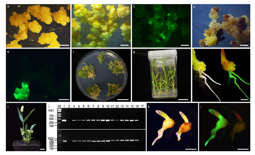 研究者對各種因素進行了測試,以開發(fā)出適合“小米”的農(nóng)桿菌介導(dǎo)的轉(zhuǎn)化方案。并挑戰(zhàn)使用成熟種子作為愈傷組織誘導(dǎo)的起始材料,以避免在使用新鮮組織(如幼花序或未成熟胚)誘導(dǎo)愈傷組織時的昂貴需求。在改良的愈傷組織誘導(dǎo)培養(yǎng)基(CIM)上進行三輪繼代培養(yǎng)后,獲得了致密的胚性愈傷組織(圖8a)。通過使用綠色熒光蛋白(GFP)報告基因來監(jiān)測農(nóng)桿菌感染效率,如圖8b、c所示,以及篩選轉(zhuǎn)基因愈傷組織的有效性?!靶∶住钡脑偕芰υ贑IM培養(yǎng)基上保持良好(圖8f)。表達GFP的轉(zhuǎn)基因植株在生根培養(yǎng)基上容易誘導(dǎo)生根,移栽到土壤后成活良好(圖8g-i)。