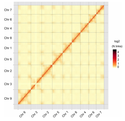 為了便于“小米”作為模型植物的使用,使用PacBio平臺組裝出429.94 Mb基因組 v1.0(k-mer預(yù)估438.26 Mb),contig N50高達18.8?Mb,Scaffold N50為42.41 Mb,并且僅包含48個Gap。其中399.4 Mb通過Hi-C錨定在9條染色體上(掛載率~93%;圖5)。根據(jù)Illumina DNA比對,組裝的錯誤率約為0.001%(每100kb有一個錯誤)。BUSCO評估結(jié)果為97.78%。這些結(jié)果表明“小米”基因組v1.0可以作為研究界的金標(biāo)準(zhǔn)參考。
