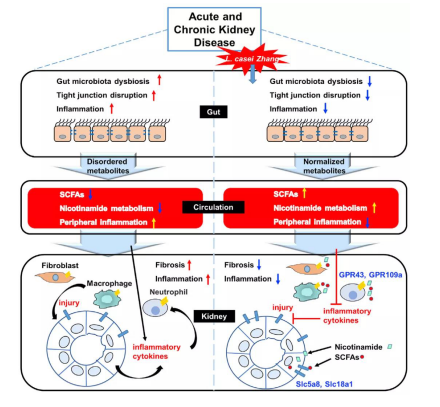 研究揭示干酪乳桿菌張(L.casei Zhang)可減緩急性和慢性腎臟疾病的進(jìn)展。首先研究人員探討了干酪乳桿菌張對(duì)腎臟損傷的影響。給缺血/再灌注(I/R)雄性小鼠損傷前后口服/不口服干酪乳桿菌,結(jié)果表明益生菌預(yù)處理后血清尿素氮(BUN)和肌酐值降低,腎臟的病理?yè)p傷降低,隨著時(shí)間的延長(zhǎng),表明使用益生菌干酪乳桿菌與較低的急性腎損傷和慢性腎纖維化密切相關(guān);隨后對(duì)小鼠糞便進(jìn)行微生物測(cè)序分析發(fā)現(xiàn),用干酪乳桿菌張預(yù)處理具有改善缺血/再灌注引起的生物失調(diào)、腸道炎癥和腸粘膜屏障損傷的能力;隨后研究人員探討了腸道菌群在腎損傷中的作用以及益生菌治療的效果是否依賴于原始腸道菌群,實(shí)驗(yàn)表明,在用廣譜抗生素(ABX)耗盡原始腸道菌群后,干酪乳桿菌仍有保護(hù)腎功能的作用,代謝組學(xué)分析顯示其升高有益代謝物SCFAs和煙酰胺,從而減少腎臟巨噬細(xì)胞和腎小管上皮細(xì)胞的炎癥反應(yīng),發(fā)揮腎臟保護(hù)作用;最后研究人員進(jìn)行了一項(xiàng)為期1年的口服干酪乳桿菌張的安慰劑對(duì)照研究,納入62例3-5期CKD患者,隨機(jī)分組到安慰劑或干酪乳桿菌張組,發(fā)現(xiàn)干酪乳桿菌張組的安全性良好,減緩了3-5期CKD患者的腎臟功能下降。