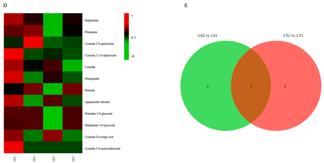 為了進(jìn)一步檢測(cè)花青素的類(lèi)型,將花青素與代謝物數(shù)據(jù)庫(kù)進(jìn)行比較。其中兩種花青素,即花青素O-丁香酸和芹菜苷氯化物,在葉芽中表現(xiàn)出較高的含量,其他花青素在葉片發(fā)育期間保持在穩(wěn)定水平(圖4D)。從“Tailihong”的葉片中鑒定出11種花青素。其中三種花青素,即芹菜苷氯化物、花青素和花青素O-丁香酸隨著成熟過(guò)程而減少。相反,四種花青素,即飛燕草素3-O-葡萄糖苷、天竺葵素、牡丹素和矮牽牛素3-O-葡萄糖苷,隨著葉片發(fā)育而增加(圖4D)。多重比較表明,氰基鄰丁香酸和芹菜素氯化物在兩個(gè)紫葉品種的葉芽著色中起著關(guān)鍵作用(圖4E)