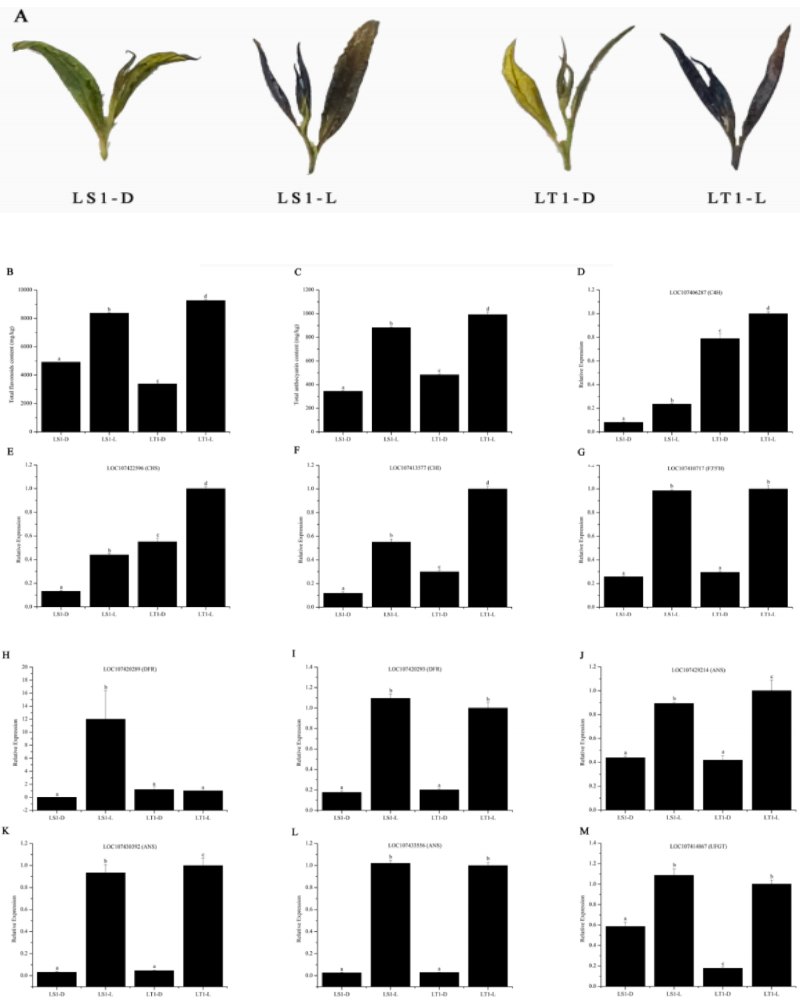 圖6暗處理?xiàng)l件(LS1-D和LT1-D)和光處理?xiàng)l件(LS1-L和LT1-L)下葉芽中類(lèi)黃酮的積累。