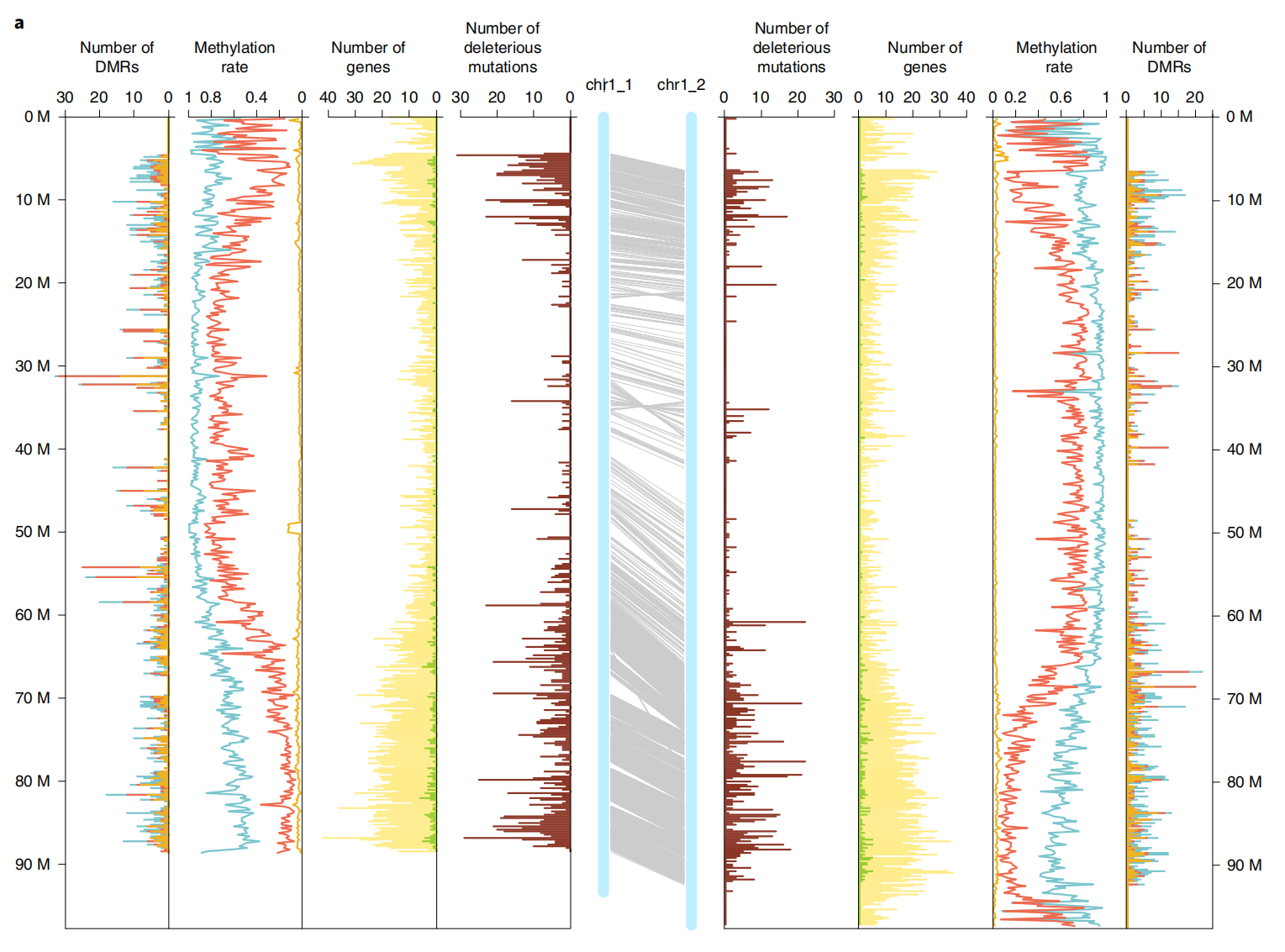 ① ?除了常規(guī)基因組中甲基化的修飾,大多數(shù)二倍體基因組組裝都忽略了同源染色體之間的差異,將基因組組裝成一個(gè)假的單倍體序列,但隨著研究的深入,發(fā)現(xiàn)僅單套的基因組數(shù)據(jù)難以完全演示高雜合物種的全面信息。同源染色體之間不同遺傳位點(diǎn)的組合對(duì)生物表型有重要影響,如動(dòng)植物中的雜種優(yōu)勢(shì)、某些物種雜交不育現(xiàn)象等。單倍型等位基因間差異對(duì)基因表達(dá)、功能及其表型都有著重要影響,大多數(shù)雜交品種的優(yōu)勢(shì)表型都受等位基因調(diào)控。二倍體馬鈴薯(Zhou Q et al., Nature Genetics.2020)、蘋果(Sun X P et al.,Nature Genetics.2020)、鐵觀音(Zhang X et al., Nature Genetics.2021)等單體型基因組的案例給我們成功展示了高雜合度的二倍體同源組間有不對(duì)稱演化的現(xiàn)象,即某套單倍型上保留較高的基因表達(dá)水平、維持較低的甲基化水平、經(jīng)歷較強(qiáng)的純化選擇(負(fù)選擇)等。