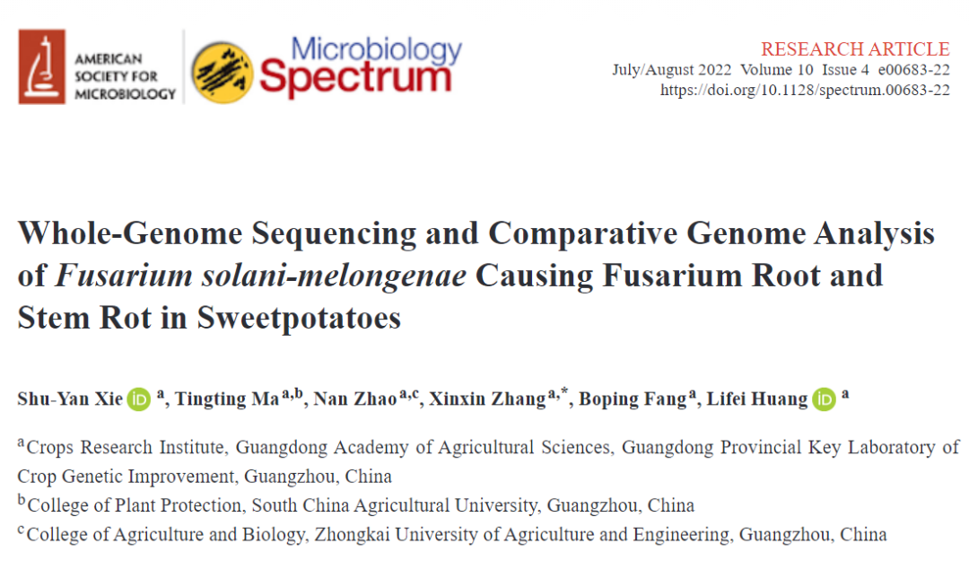近日, Microbiology Spectrum(IF 9.0431)在線發(fā)表了廣東省農(nóng)科院作物所黃立飛副研究員、房伯平研究員為通訊作者的研究論文 “Whole-Genome Sequencing and Comparative Genome Analysis of?Fusarium solani-melongenae?Causing Fusarium Root and Stem Rot in Sweetpotatoes”,該研究報(bào)道了F. solani-melongenae?分離株 CRI 24-3 的全基因組組裝序列,并且深入探討其功能基因信息,為其他密切相關(guān)的鐮刀菌屬物種的基因組研究提供基礎(chǔ),通過(guò)比較基因組分析促進(jìn)了對(duì)鐮刀菌基因組特征和進(jìn)化關(guān)系的整體理解。百邁客有幸參與此項(xiàng)研究工作,對(duì)該真菌全基因組進(jìn)行測(cè)序組裝注釋和比較基因組分析。摘要