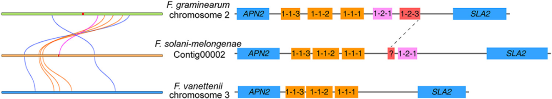 其他三種密切相關(guān)的 FSSC 物種F. falciforme、F. solani和F. vanettenii的基因組被用作參考基因組來(lái)探索 CRI 24-3 的選擇壓力。分別確定了 CRI 24-3 與?F. falciforme、F. solani?和F. vanettenii?之間的 2265、2272 和 2272 直系同源物對(duì)的非同義替換率 (Ka) 與同義替換率 (Ks) 的比率( 圖 6C 至 E)。Ka /Ks總體分析的值小于 1,表明 CRI 24-3 中的大多數(shù)直系同源物似乎都經(jīng)過(guò)了純化選擇并且高度保守。然而,CRI 24-3 和F. falciforme基因組的比較確定了一個(gè)快速進(jìn)化基因?qū)Γ‥VM0014458.1 與 GE10416_g)的 Ka /Ks比率大于 1,表明陽(yáng)性選擇可能發(fā)生在進(jìn)化。基因組共線性分析表明,F. vanettenii和F. oxysporum基因組中的幾個(gè)染色體片段在 CRI 24-3 中濃縮成一個(gè)片段,并有一些倒位(圖 6F )。此外,CRI 24-3 中的一些直系同源物具有多對(duì)一的關(guān)系。CRI 24-3 中至少有兩個(gè)查詢基因與參考物種中的相同直系同源物匹配。值得注意的是,CRI 24-3 的重要基因組區(qū)域不能與尖孢鐮刀菌基因組中的那些共線性耦合,由 35.9% 的共線性率(共線直系同源物對(duì)與所有直系同源物對(duì)的比率)支持,該比率低于CRI 24-3 和F. vanettenii?(77.6%)。結(jié)果表明,CRI 24-3在系統(tǒng)發(fā)育上與尖孢鐮刀菌相距較遠(yuǎn)。MAT基因座對(duì)于在鐮刀菌屬中產(chǎn)生子囊孢子至關(guān)重要。在此,交配型結(jié)構(gòu)組織 ( MAT ) 基因座在基于簡(jiǎn)化的共線性分析比較了茄科鐮孢菌CRI 24-3、禾谷鐮刀菌PH-1 和F. vanettenii?77-13-4(圖 7)。與僅攜帶 MAT1-1 基因的?F. vanettenii?77-13-4相比, CRI 24-3 含有MAT1-1和MAT1-2獨(dú)特型基因,在單個(gè)MAT基因座處與禾谷鐮刀菌密切相關(guān),除了 CRI 24-3 是 MAT1-2-3 缺陷型。只有位于 CRI 24-3 中 MAT1-2-1 上游區(qū)域的沒(méi)有任何特征功能域的片段與禾谷鐮刀菌中的 MAT1-2-3 具有序列相似性。