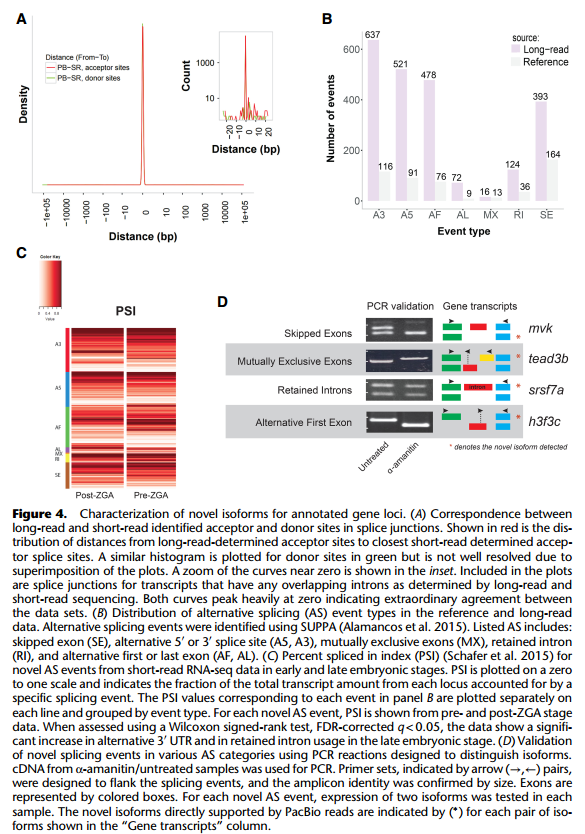 作者接著對(duì)全長(zhǎng)轉(zhuǎn)錄組對(duì)已注釋基因鑒定到的未記錄的轉(zhuǎn)錄本的可變剪切形式的研究。 由于斑馬魚(yú)參考基因組對(duì)可變剪切的注釋較少,文章使用短讀長(zhǎng)的轉(zhuǎn)錄組數(shù)據(jù)對(duì)可變剪切位 點(diǎn)進(jìn)行驗(yàn)證。作者使用 STAR 軟件分析轉(zhuǎn)錄組數(shù)據(jù),預(yù)測(cè)了 3000 個(gè)可變剪切位點(diǎn),其中 99% 可以與全長(zhǎng)轉(zhuǎn)錄本數(shù)據(jù)吻合。剪接位點(diǎn)的這種近乎完美的一致性支持證明了全長(zhǎng)轉(zhuǎn)錄組鑒定 的外顯子 – 內(nèi)含子邊界的準(zhǔn)確性,并強(qiáng)烈支持新檢測(cè)到的可變剪接形式的有效性。通過(guò)全 長(zhǎng)轉(zhuǎn)錄組共發(fā)現(xiàn)了 2000 種新型可變剪切類型,其中已注釋基因的新型可變剪切共 1835 中, 平均每個(gè)基因的可變剪切類型提升 50%。