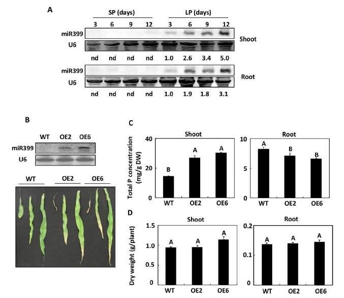 圖1:MIR399b過表達轉化玉米在水培下的表型,A,smallRNAnorthernblot顯示在Pi缺乏的玉米根和地上部分的miR399是上調的;B,水培下的MIR399b過表達玉米的Pi中毒表型;C,Pi缺乏條件下,野生型和突變體玉米中根和地上部分的P濃度;D,Pi缺乏條件下,野生型和突變體的根和地上部分的干重。