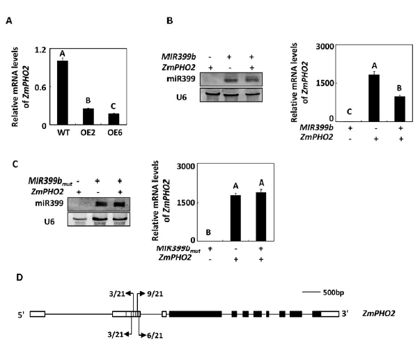 圖2:ZmPHO2被miR399轉錄后調控。A,qPCR檢測過表達轉化株的ZmPHO2轉錄本的表達;B、C,通過northernblot檢測MIR399b/MIR399bmut和ZmPHO2在煙草中的表達;D,通過5,RACE檢測ZmPHO2的切割位點