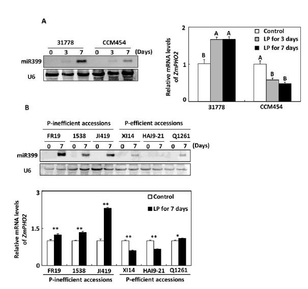 圖3:在磷高效和磷低效玉米株系中miR399的表達分析。A,在玉米自交系31778和CCM454中miR399和ZmPHO2轉錄本的表達;B,在其他玉米株系中miR399和ZmPHO2轉錄本的表達
