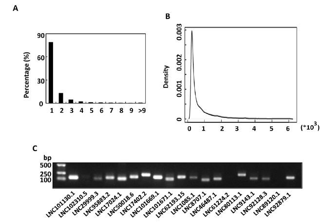 圖4:玉米lncRNAs的鑒定。A,每個lncRNA轉錄本的外顯子分布;B,lncRNA的外顯子長度密度分布;C,RT-PCR證實隨機選擇的lncRNA