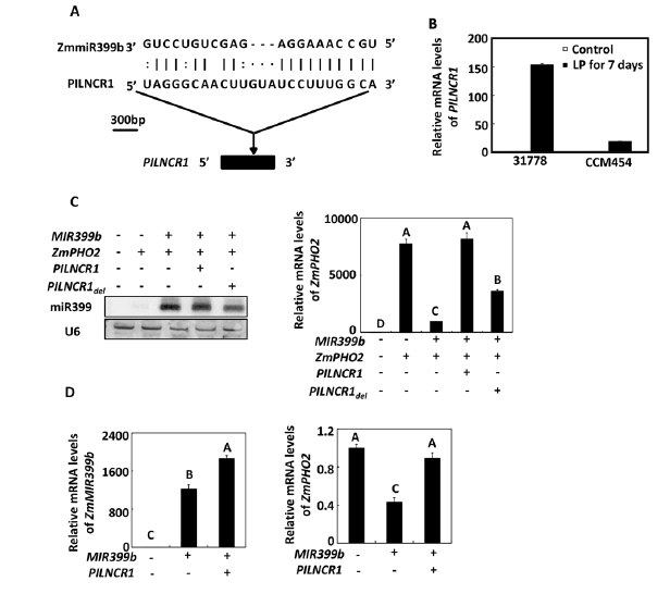 如圖5A,由于lncRNA819包含ZmmiRNAd的一段互補區(qū)域,所以它吸引了我們的注意力。使用3,和5,RACE,一個不包含內含子的677bp的cDNA的序列被克隆出來。如圖5B,在磷高效玉米CCM454和磷低效玉米31778植株中,lncRNA819被磷缺乏誘導顯著表達,因此我們將lncRNA819叫做PILNCR1。