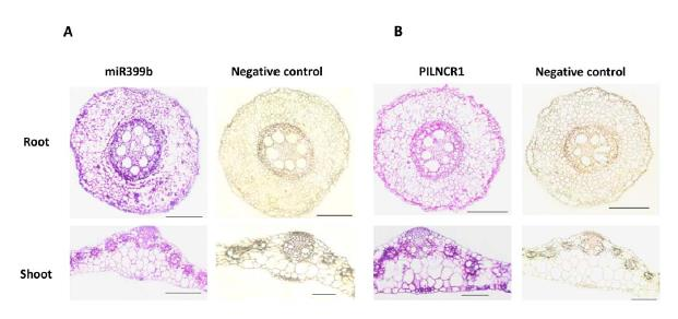 為了進一步揭示ZmmiR399b和PILNCR1之間可能的關系,我們通過原位雜交驗證ZmmiR399b和PILNCR1的表達模式。由于在磷充足條件下,ZmmiR399b和PILNCR1在玉米中的豐度比較低,于是去在pi缺乏條件下的第7天的玉米根和地上部分來驗證ZmmiR399b和PILNCR1表達模式。ZmmiR399b和PILNCR1在玉米的根和地上部分均能被檢測到,尤其是在維管束里,見圖6A-B。這些結果顯示ZmmiR399b和PILNCR1的空間定位至少有部分是重合的。