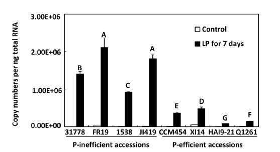 為了驗證這些結果,我們還檢測了另外三株磷低效株系(FR19、1538、J1419)和三株磷高效株系(X114、HAI9-21、Q1261)的ZmmiR399的表達,這些株系是通過560個株系中鑒定出來的。如圖3B,其結果與在31778和CCM454中是一致的,除了Q1261以外。在磷缺乏處理7天后,ZmPHO2轉錄本在磷高效株系中是下調的,在磷低效株系中是上調的。