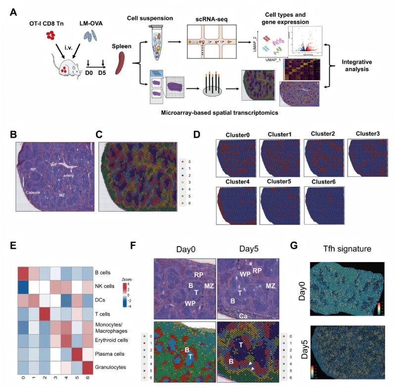 為了研究免疫反應過程中不同免疫細胞的空間分布和CD8+?T細胞分化的調(diào)節(jié)機制,研究人員通過整合單細胞RNA測序(scRNA-seq)和BMKMANU?S1000空間轉錄組(ST)技術,分析了急性感染模型中脾臟免疫細胞的空間分布與CD8??T細胞分化機制。實驗采用OT-I轉基因小鼠模型,通過李斯特菌(LM-OVA)感染誘導免疫反應,關鍵發(fā)現(xiàn)包括:1)脾臟形成7個功能集群(B細胞、T細胞、單核/巨噬細胞等);2)感染后T/B細胞區(qū)擴大,APCs(B細胞、DC、巨噬細胞)在T細胞區(qū)外圍聚集;3)空間重組與T細胞分化(MP/TE亞群)顯著相關。多組學整合揭示了免疫微環(huán)境的動態(tài)調(diào)控機制,為理解感染中細胞互作提供了多組學視角。
