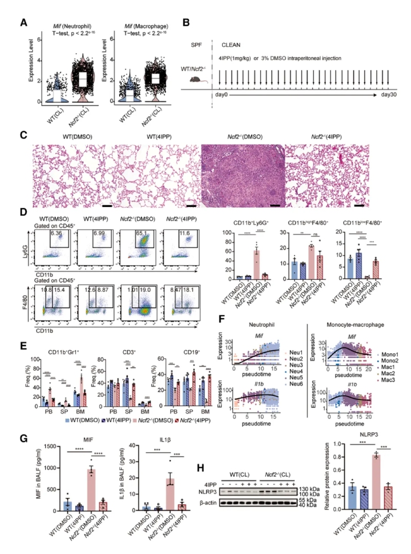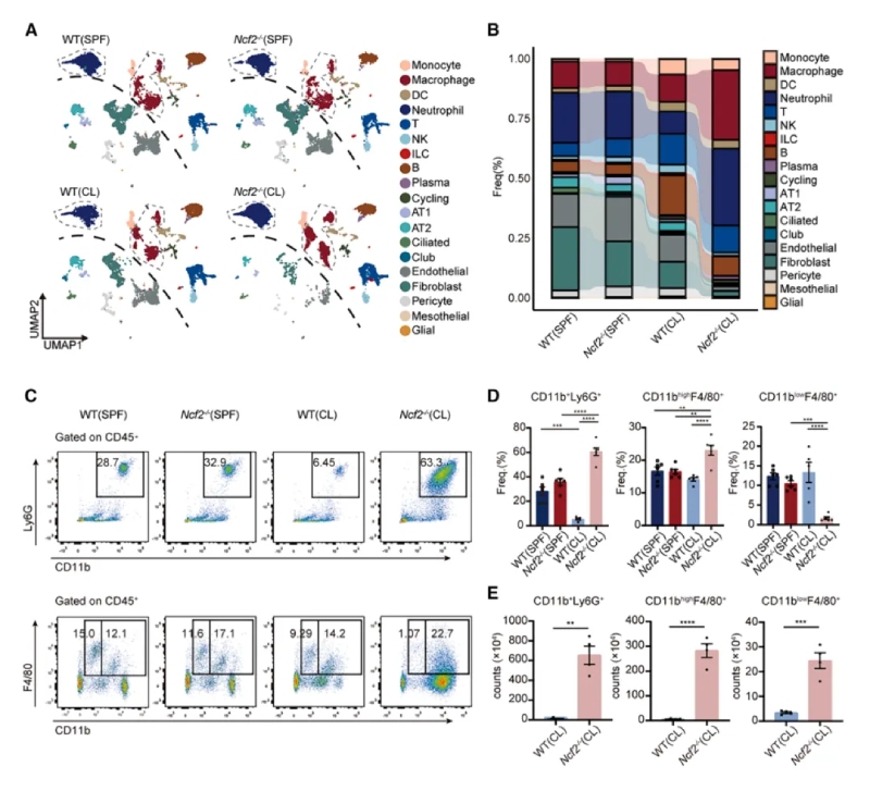 通過不同環(huán)境暴露(SPF或CL)實驗,系統(tǒng)研究了環(huán)境病原體對CGD遺傳背景小鼠表型的影響。表現(xiàn)為HE染色全肺葉顯微圖像可見CL環(huán)境下的Ncf2?/?小鼠肺部出現(xiàn)明顯的肉芽腫結構,伴隨炎癥細胞浸潤和組織壞死,其他組小鼠肺部正常。免疫熒光顯示肉芽腫中的巨噬細胞(CD68+)表達上皮標志物E-cadherin,提示巨噬細胞發(fā)生上皮樣轉化。通過ELISA法檢測CL?Ncf2?/?小鼠血清中的IL-1β和IFN-γ炎癥相關蛋白水平較CL?WT組增加。16S?rRNA/ITS?測序顯示CL?Ncf2?/?小鼠肺部細菌(如克雷伯菌和葡萄球菌)和真菌(如Talaromyces)負荷顯著增加。