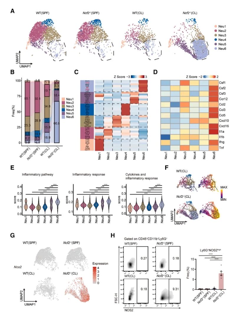 研究顯示,中性粒細胞分為6個亞群,其中Neu6亞群在CL?Ncf2?/?小鼠中顯著擴增且Neu6高表達促炎基因(如Nos2、Mif、Tnf、Il1b)。NO是一種在病原體清除過程中起關鍵作用由NOS2合成的可擴散小分子,CL?Ncf2?/?小鼠肺部的總NO生成量顯著升高。流式驗證顯示CL?Ncf2?/?小鼠肺中NOS2high中性粒細胞比例顯著增加。這些結果均提示NOS2high中性粒細胞通過產生一氧化氮(NO)和促炎因子,驅動肉芽腫核心區(qū)的炎癥反應。