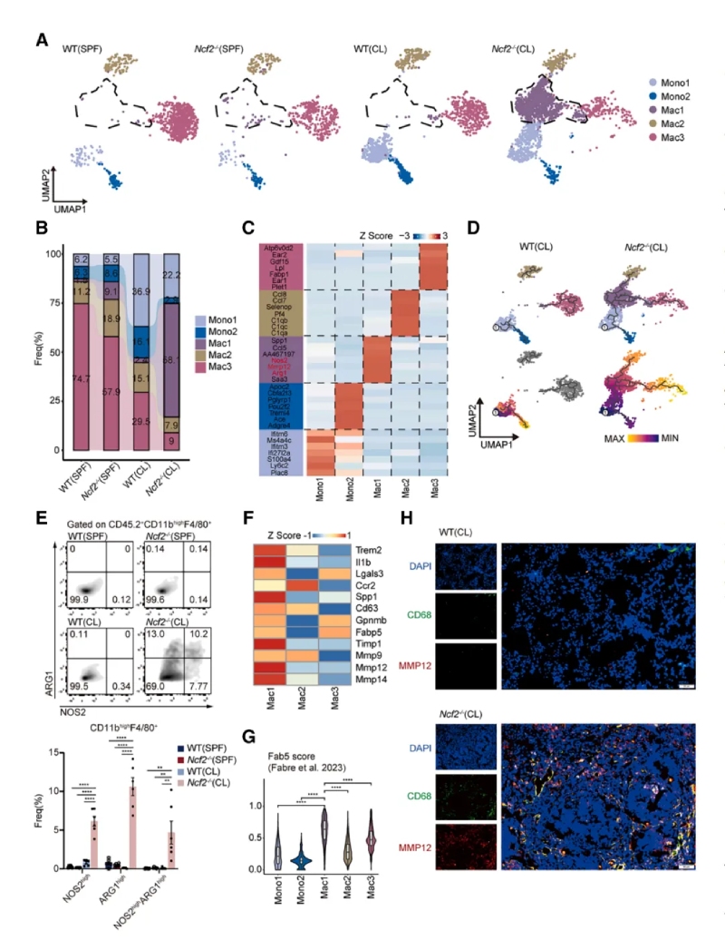 通過對巨噬細胞亞群進行聚類分析和功能富集,發(fā)現(xiàn)巨噬細胞分為5個亞群,Mac1亞群在CL?Ncf2?/?小鼠中顯著增加。Mac1同時表達M1(Nos2)和M2(Arg1)標志物,以及促纖維化基因(如Mmp12、Spp1)。免疫熒光顯示MMP12+巨噬細胞特異性分布于肉芽腫外圍。以上結果提示MMP12+巨噬細胞具有混合表型,可能通過細胞外基質重塑促進肉芽腫的纖維化包裹。